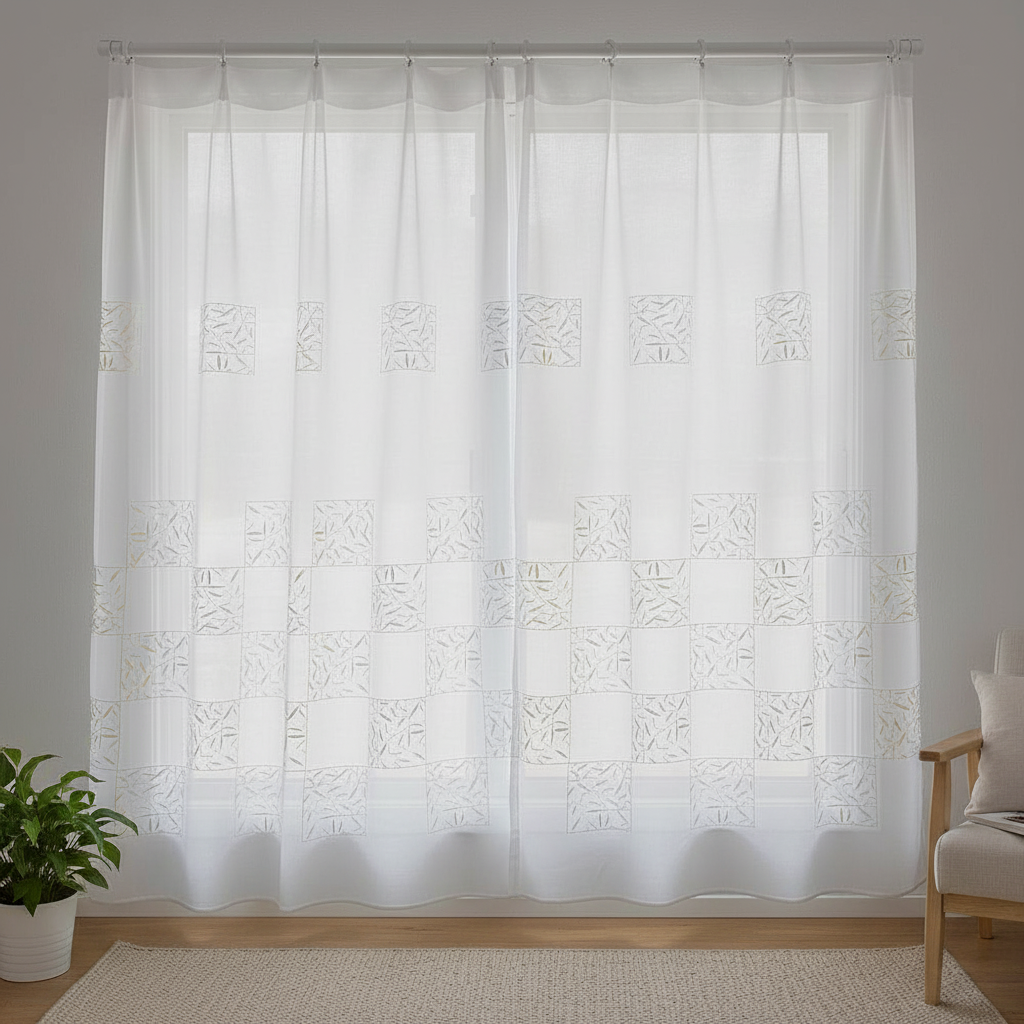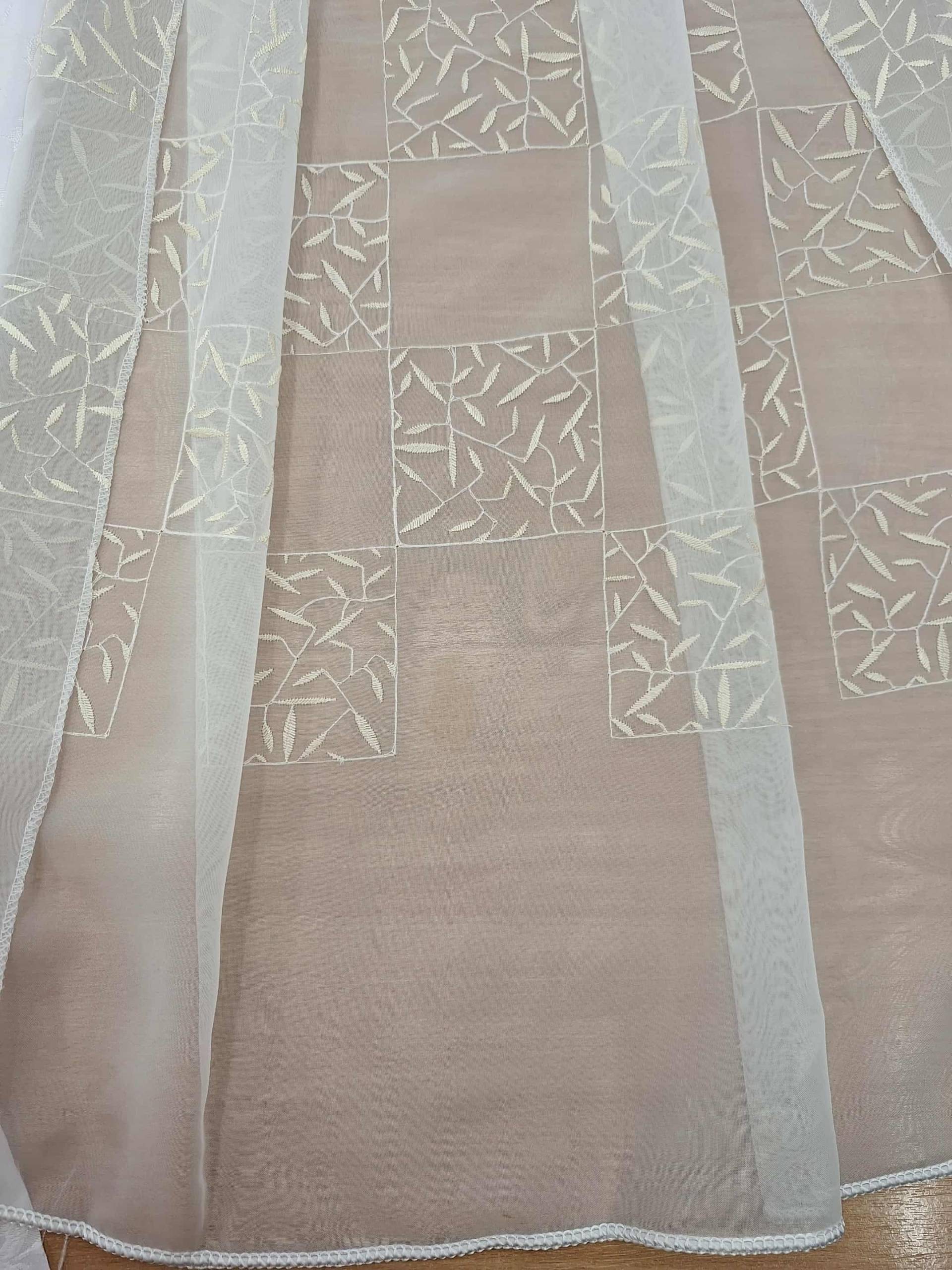Fehér alapon világos arany hímzéssel, a minta felfelé ritkul. Alul ólomzsinórral.