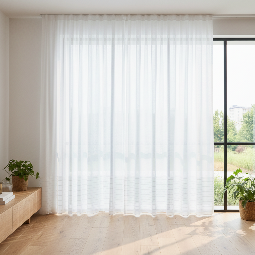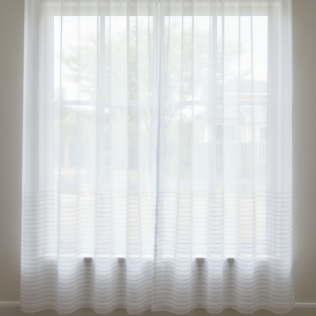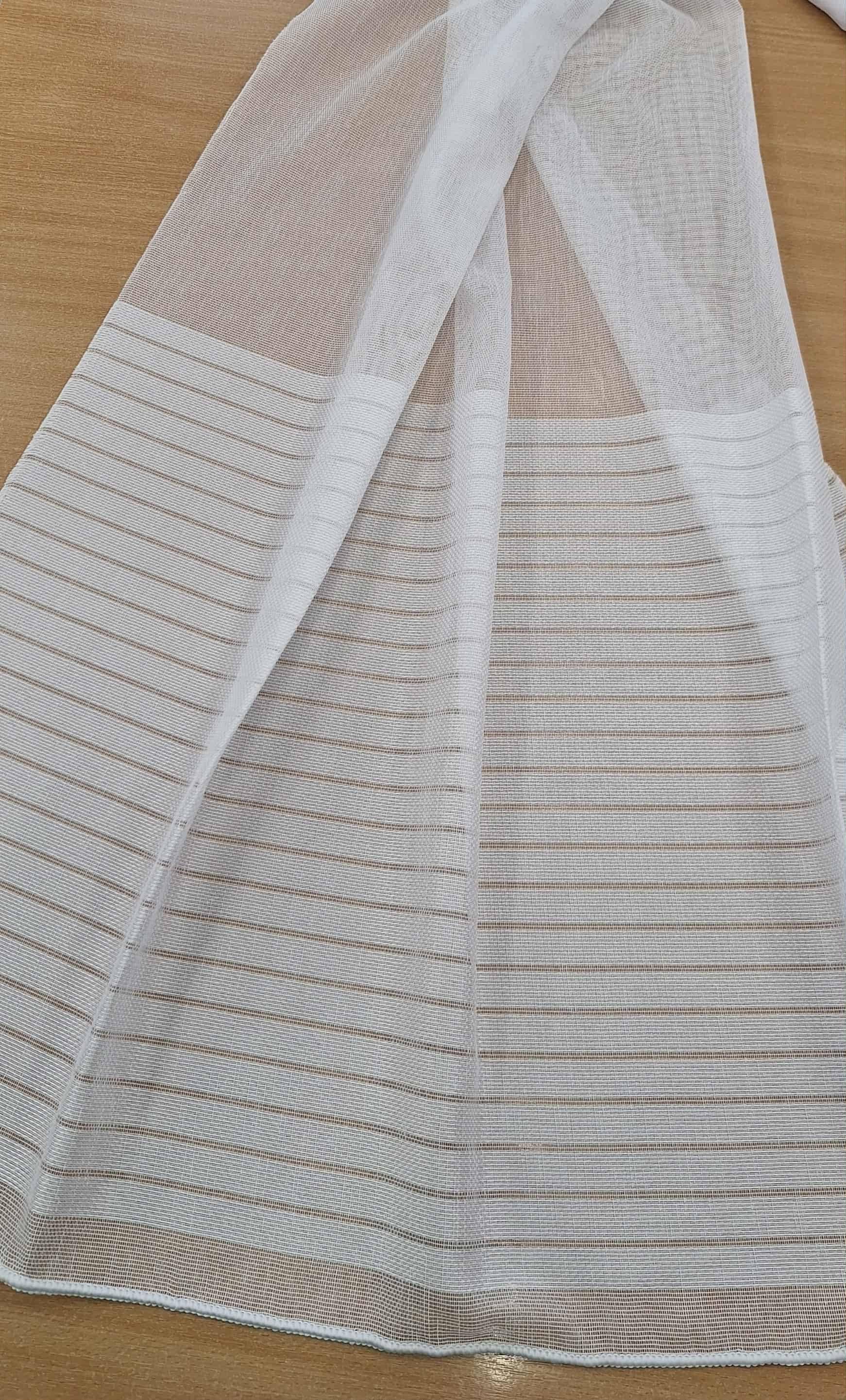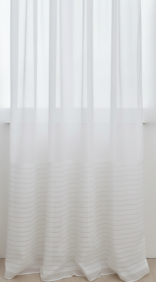 Közepesen fényáteresztő, természetes hatású függönyanyag. Természetes tapintása és modern mintája miatt egyedi, mégis közkedvelt.  A csíkozottság csak alul, 50 cm magasságban van jelen. E feletti magasságban minta nélküli az anyag.