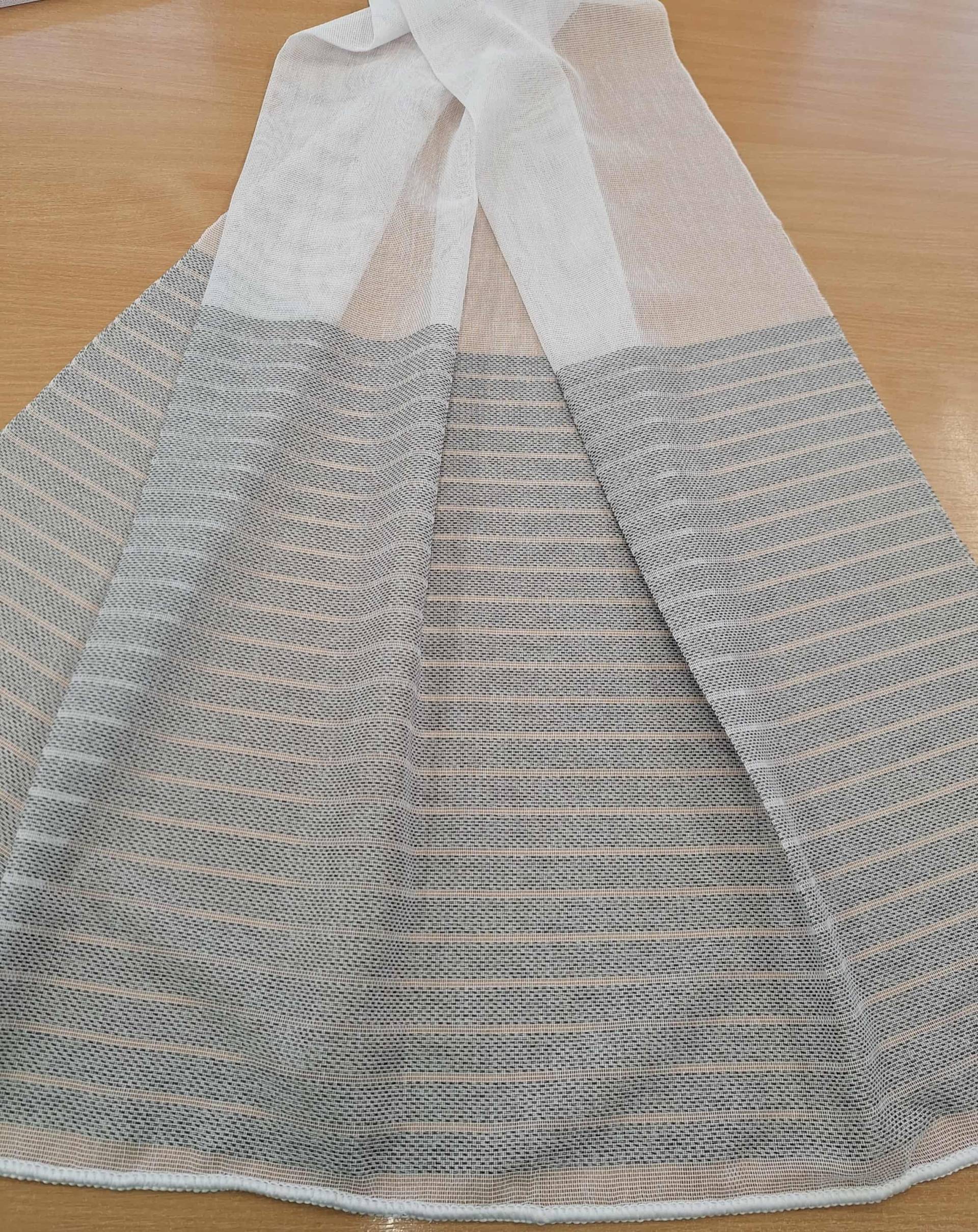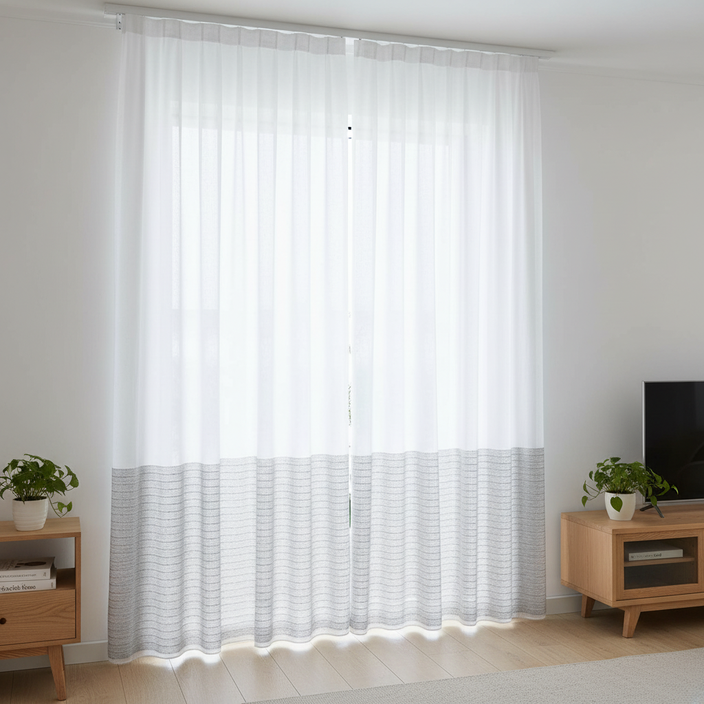 Közepesen fényáteresztő, természetes hatású függönyanyag. Természetes tapintása és modern mintája miatt egyedi, mégis közkedvelt. A csíkozottság alul szürke színben van jelen, e feletti magasságban minta nélküli az anyag.