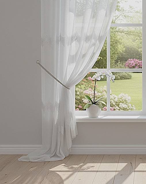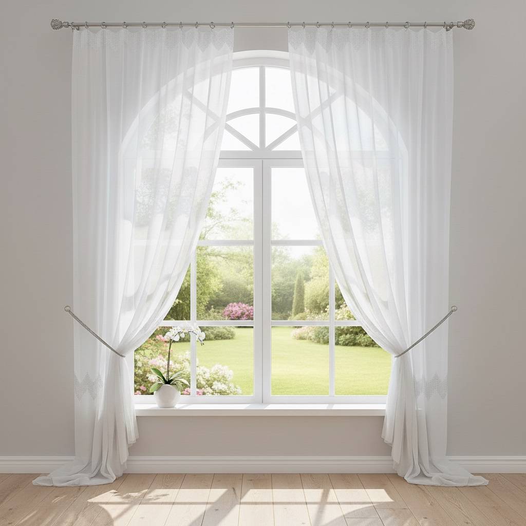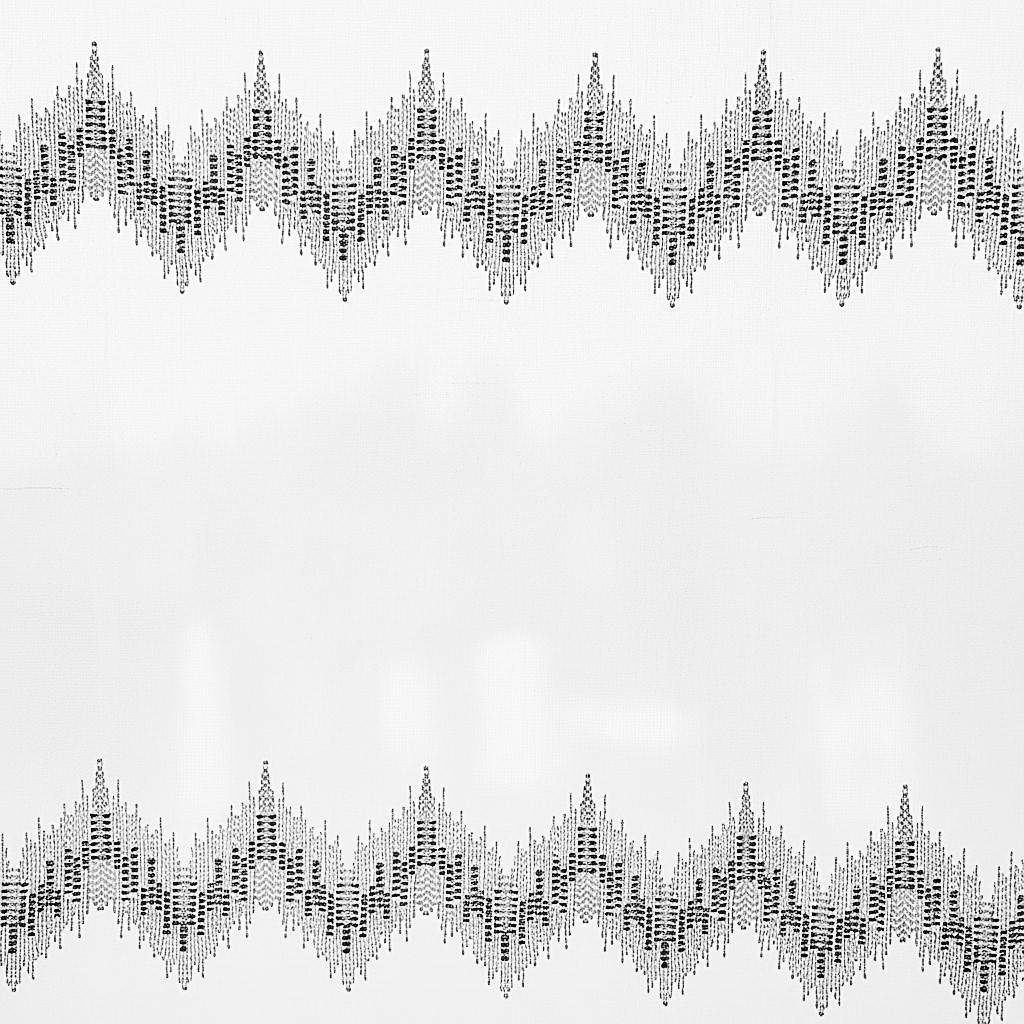 3 sorban hímzett fehér függöny, a hímzés 3 sorban fut, a magassága: 80 cm, a függöny teljes magassága 295 cm.