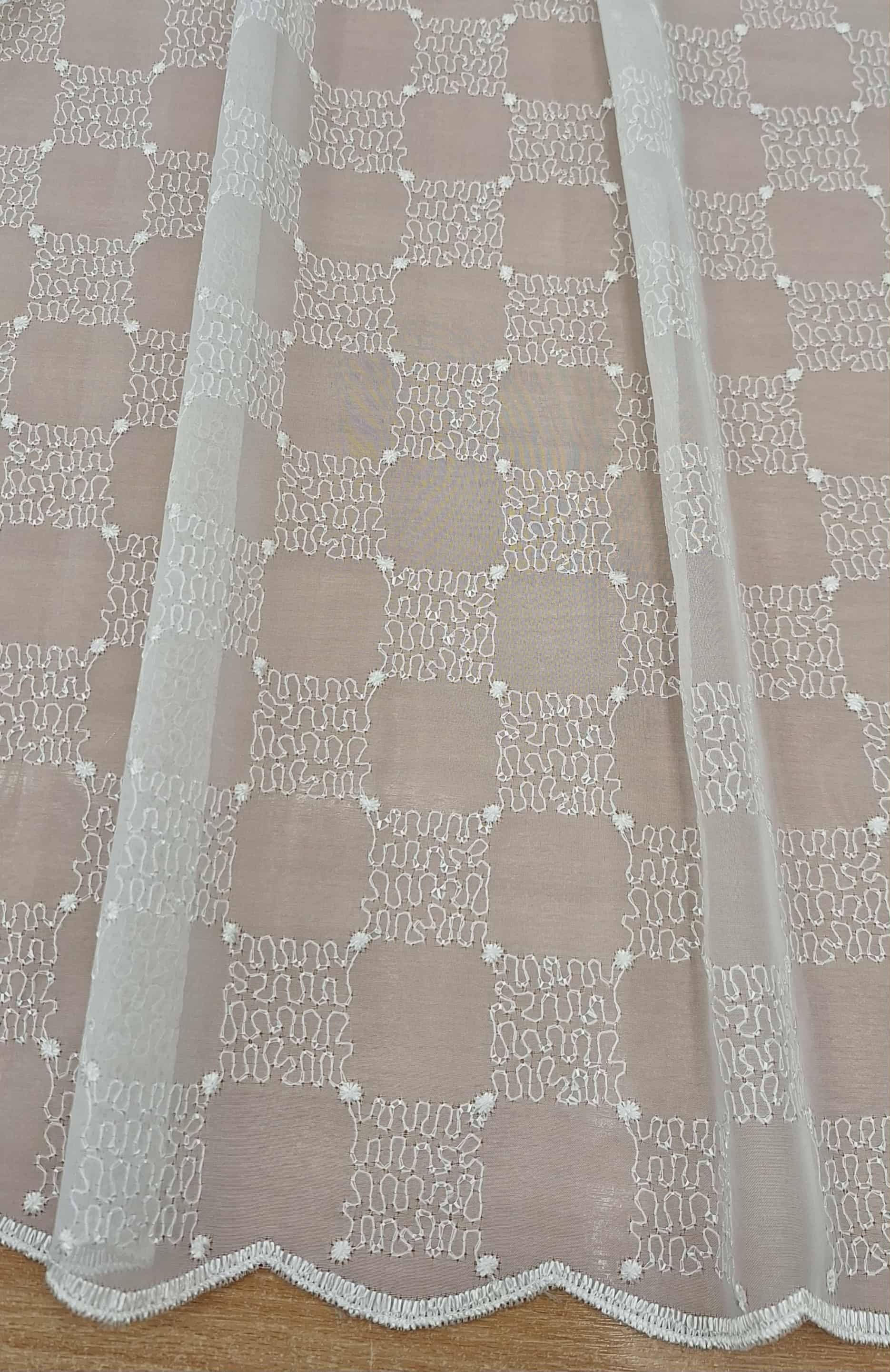 Hímzett voile függöny, törtfehér színben. 280 cm magasságban.