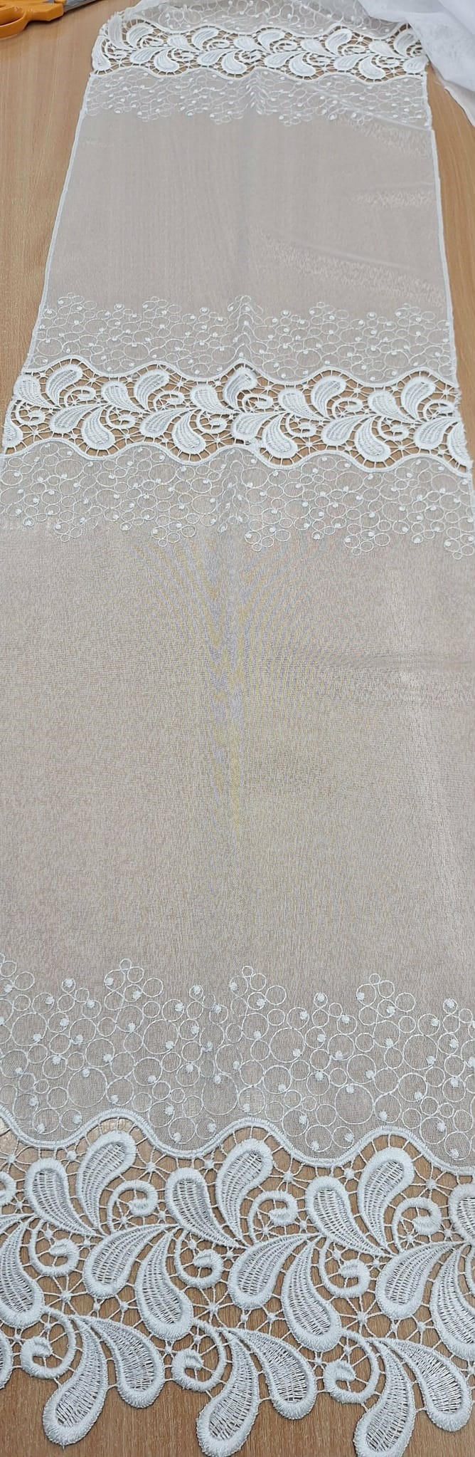 3 sorban hímzett, a bordűrtől mérve 150 cm magasságig hímzett. E felett minta nélküli a függöny.