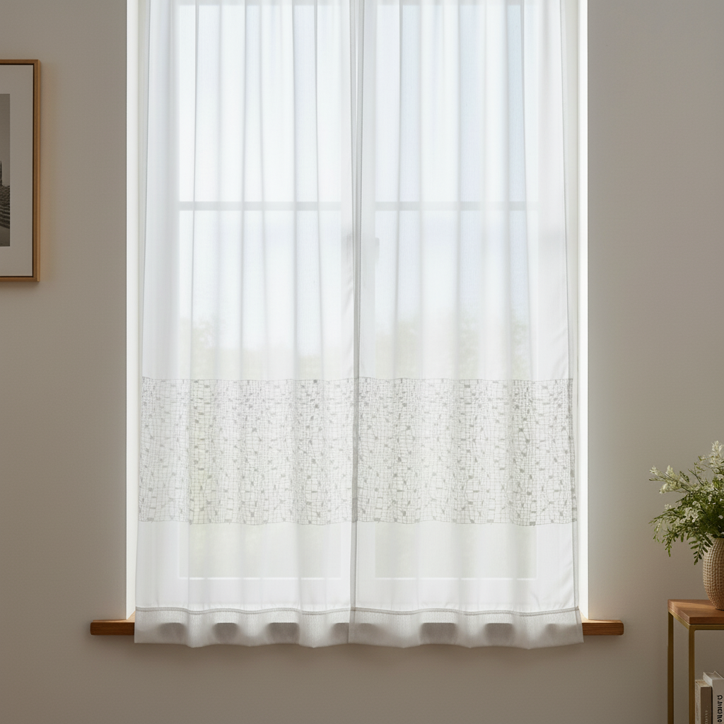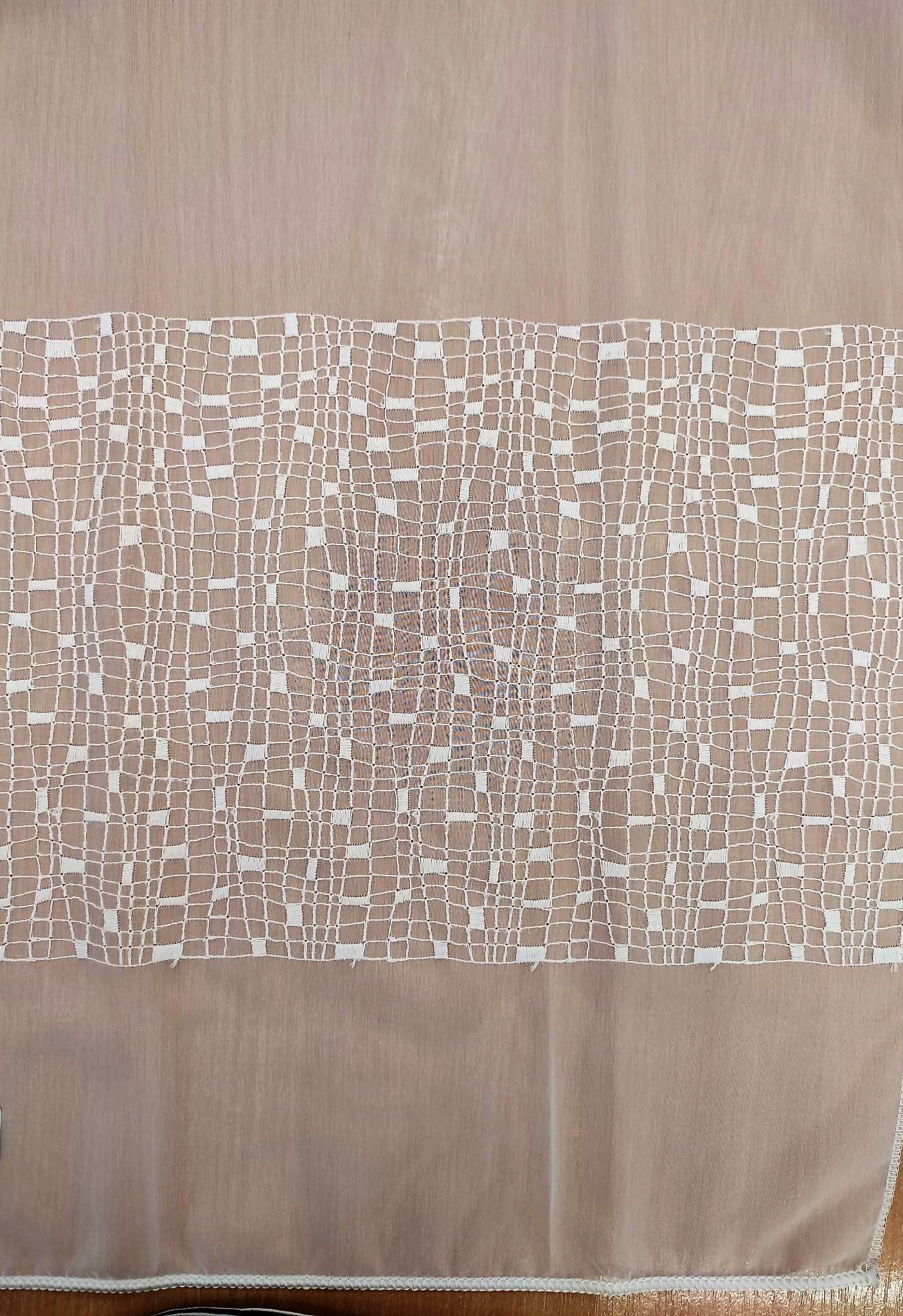 Alul hímzett fényáteresztő függöny, fehér alapon. Az ólomzsinórtól mérve 15-45 cm-ig tart a hímzés.