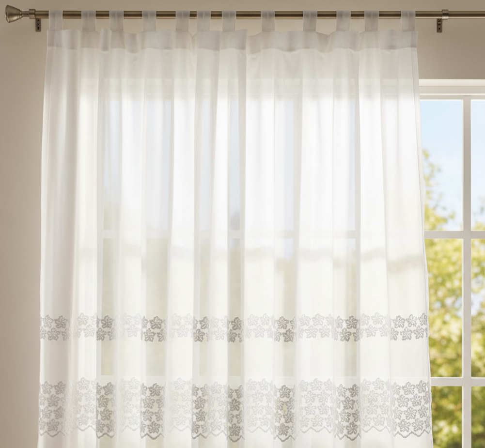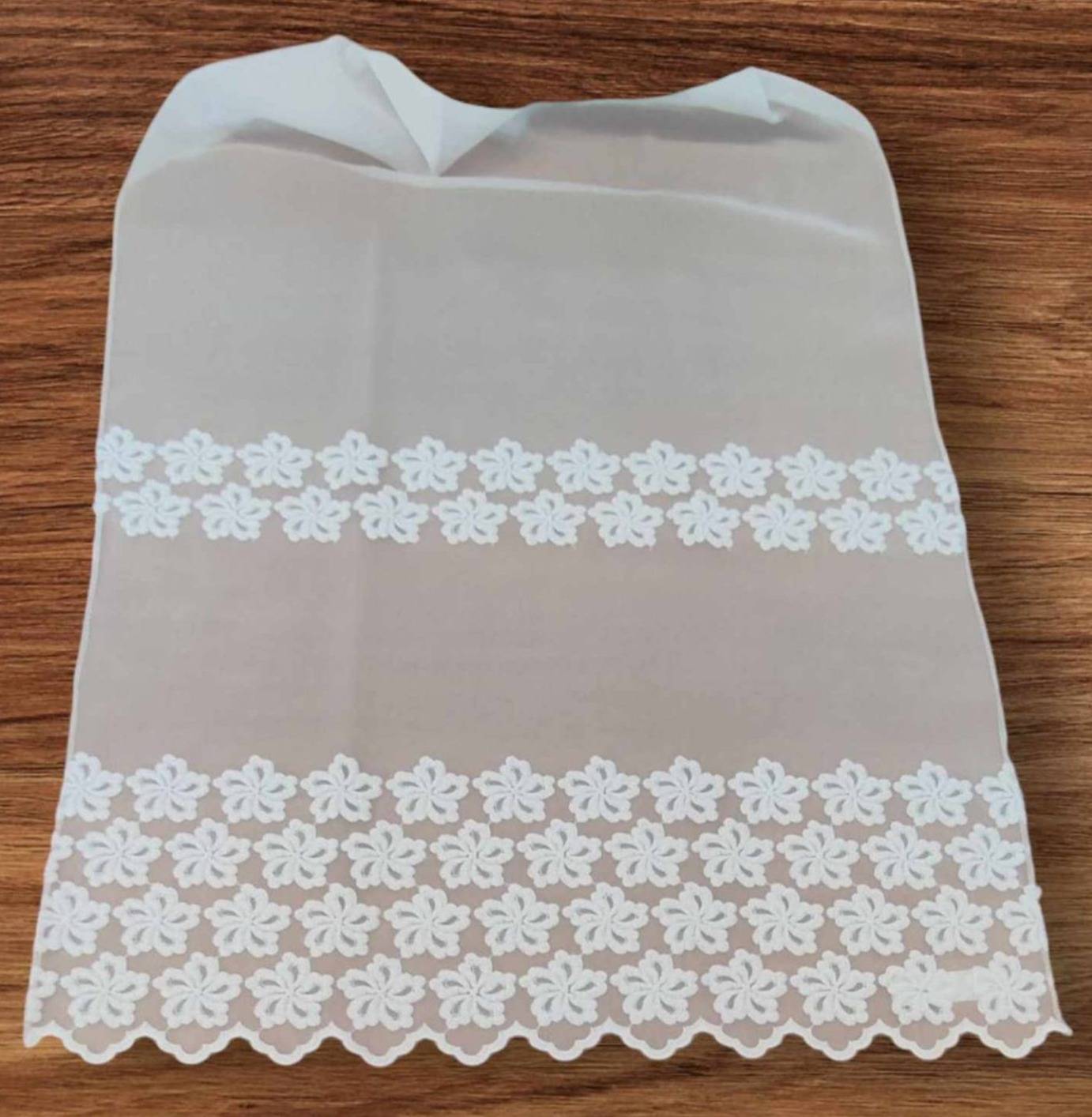 Két sorban hímzett függöny batiszt alapon. Alulról 46 cm magasságban van a bordűr (hímzett rész), e felett minta nélküli az anyag.