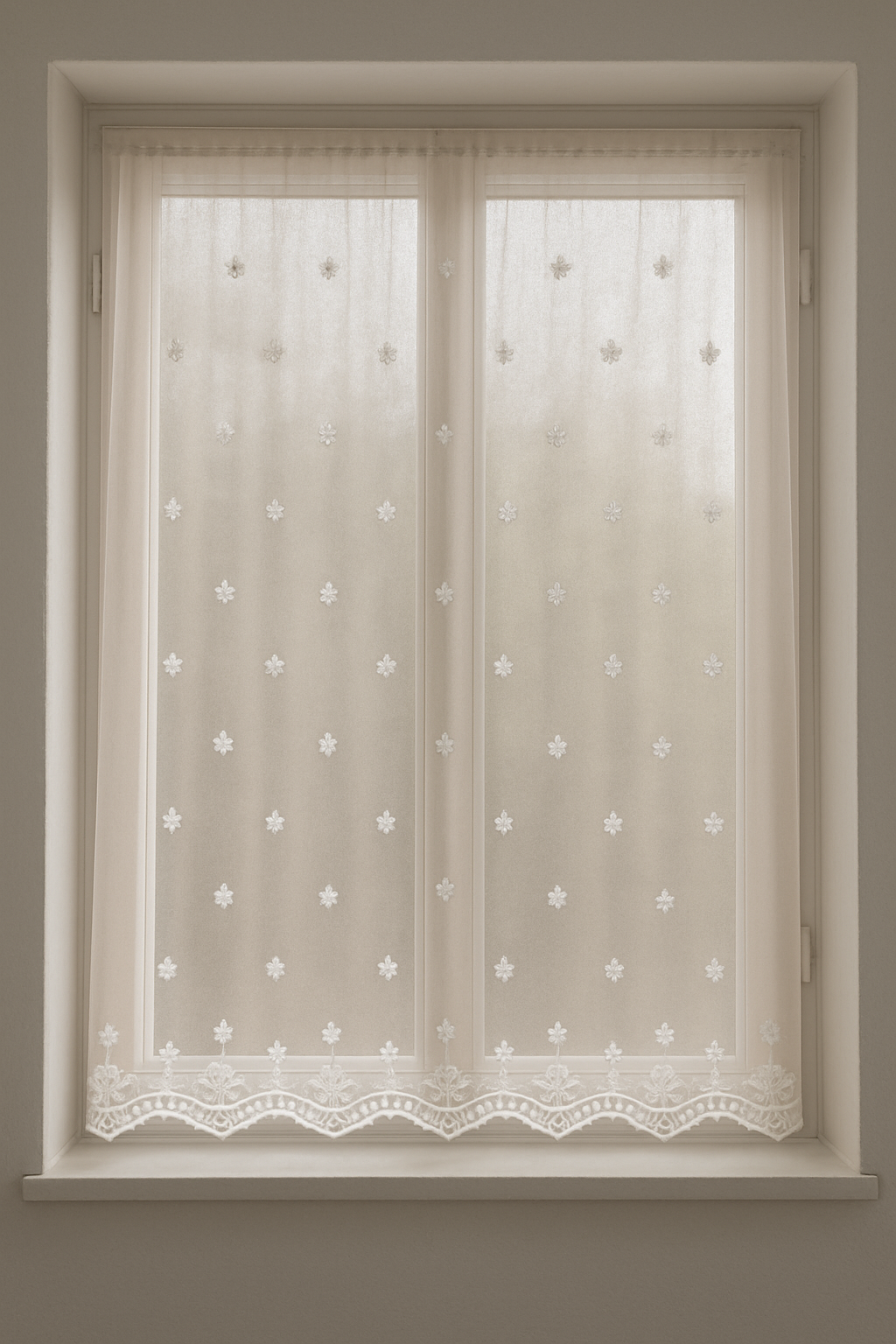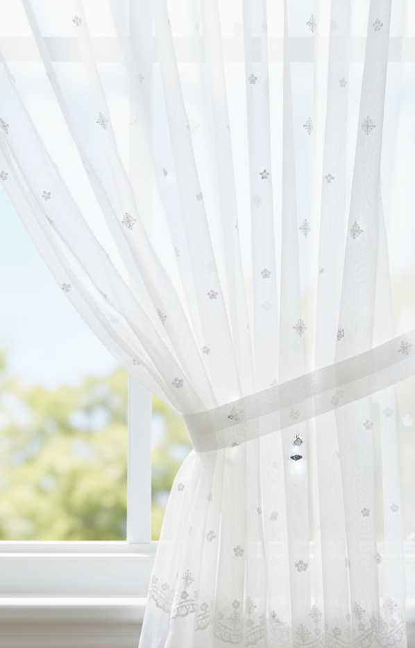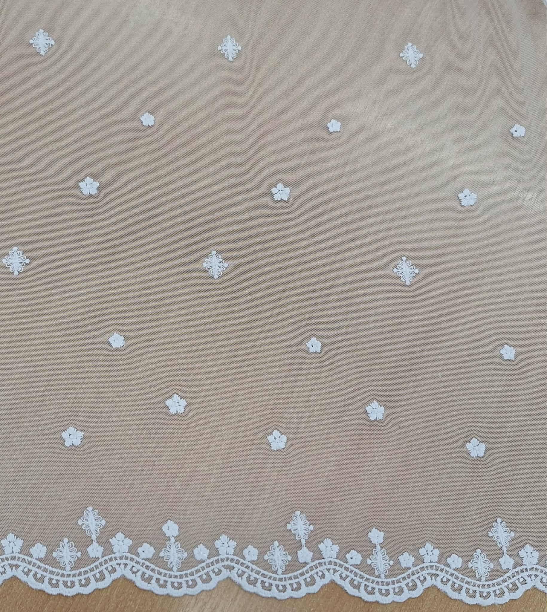 Hímzett tüll függöny, melynek fehér hímzése enyhén csillogó.