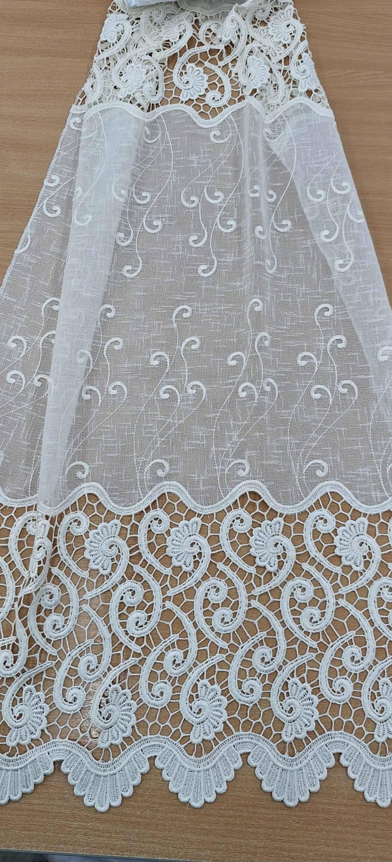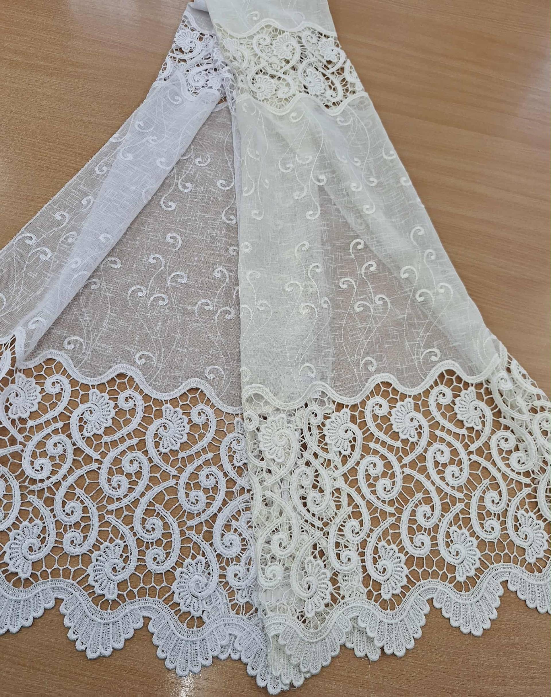 2 sorban applikált, hímzett függöny. A két sor magassága alulról 87 cm. Az alsó applikált sor bordűrrel 27 cm magas.A két sor közötti távolság 40 cm van. A felette lévő applikált sor 20 cm magas.