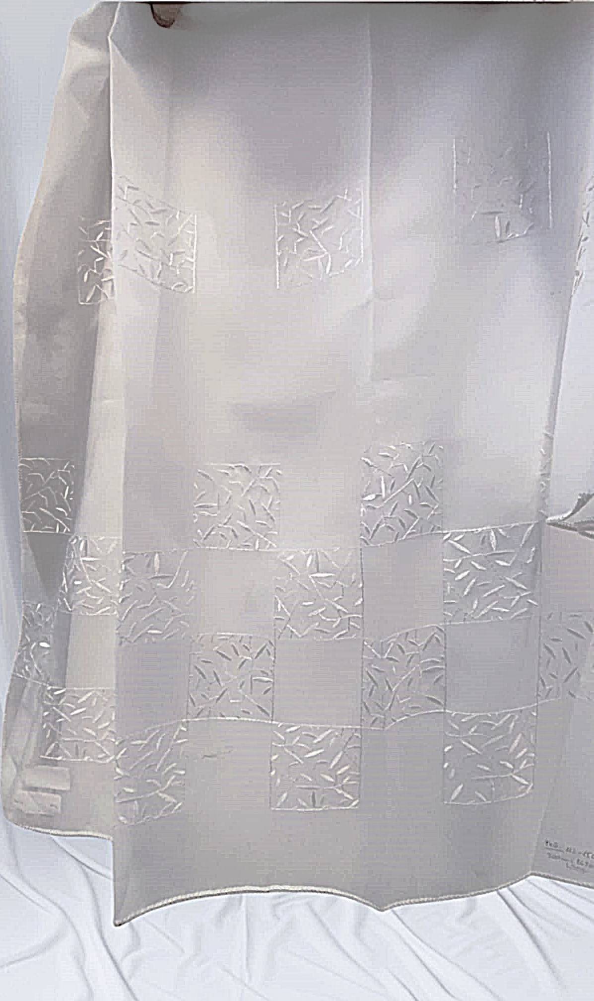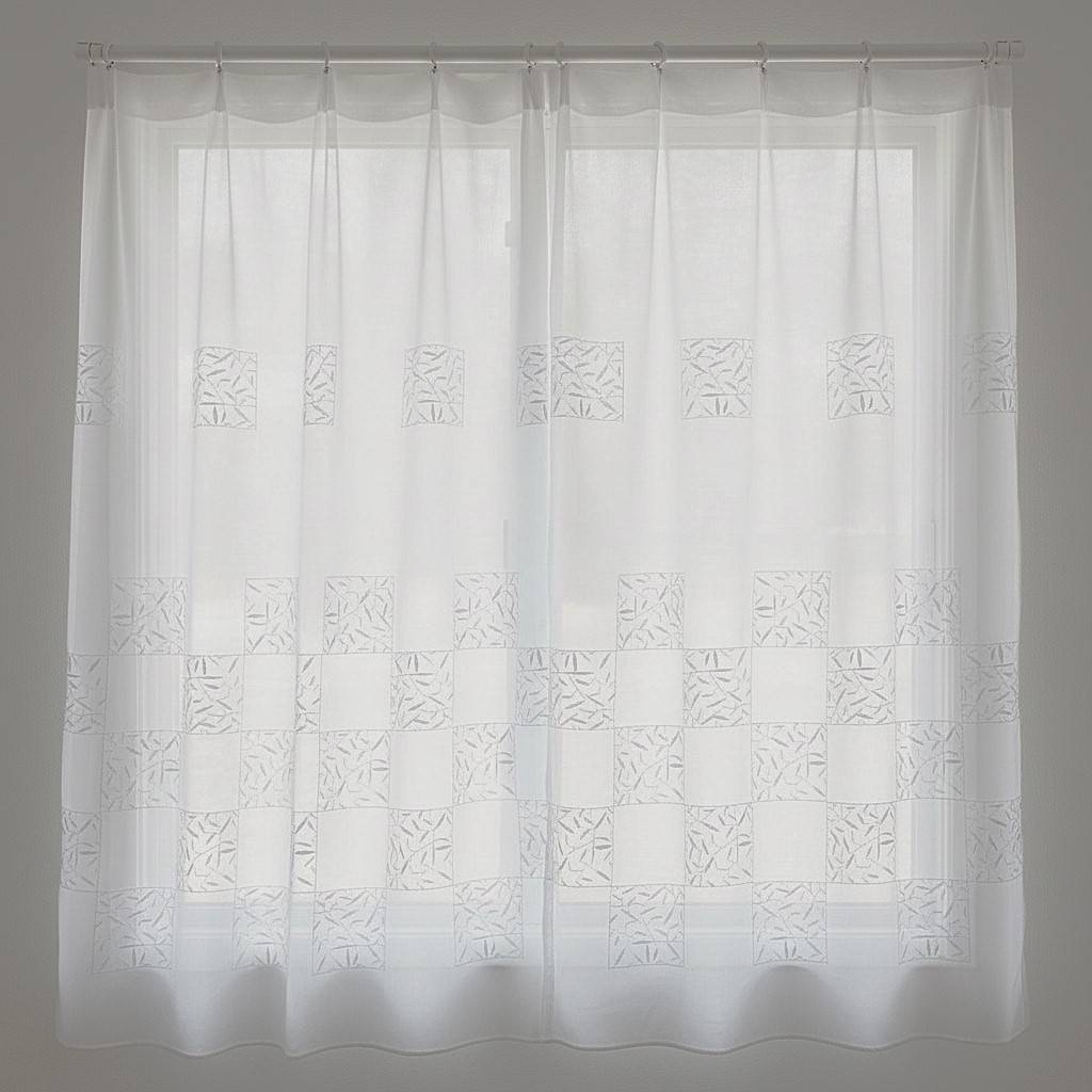 Fehér alapon fehér hímzett függöny. A hímzés felfelé ritkul. Alul ólomzsinórral.