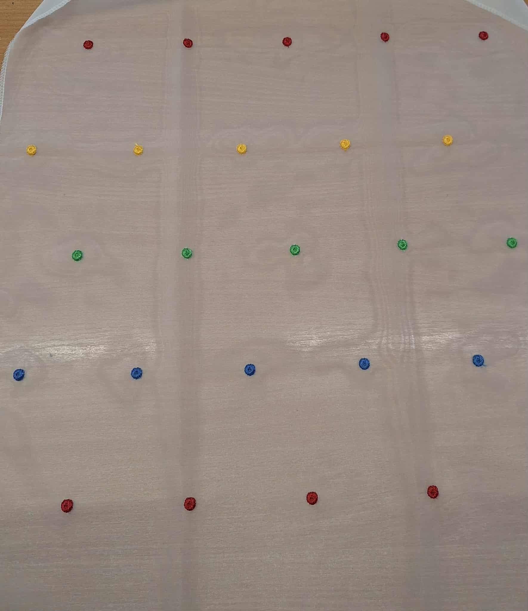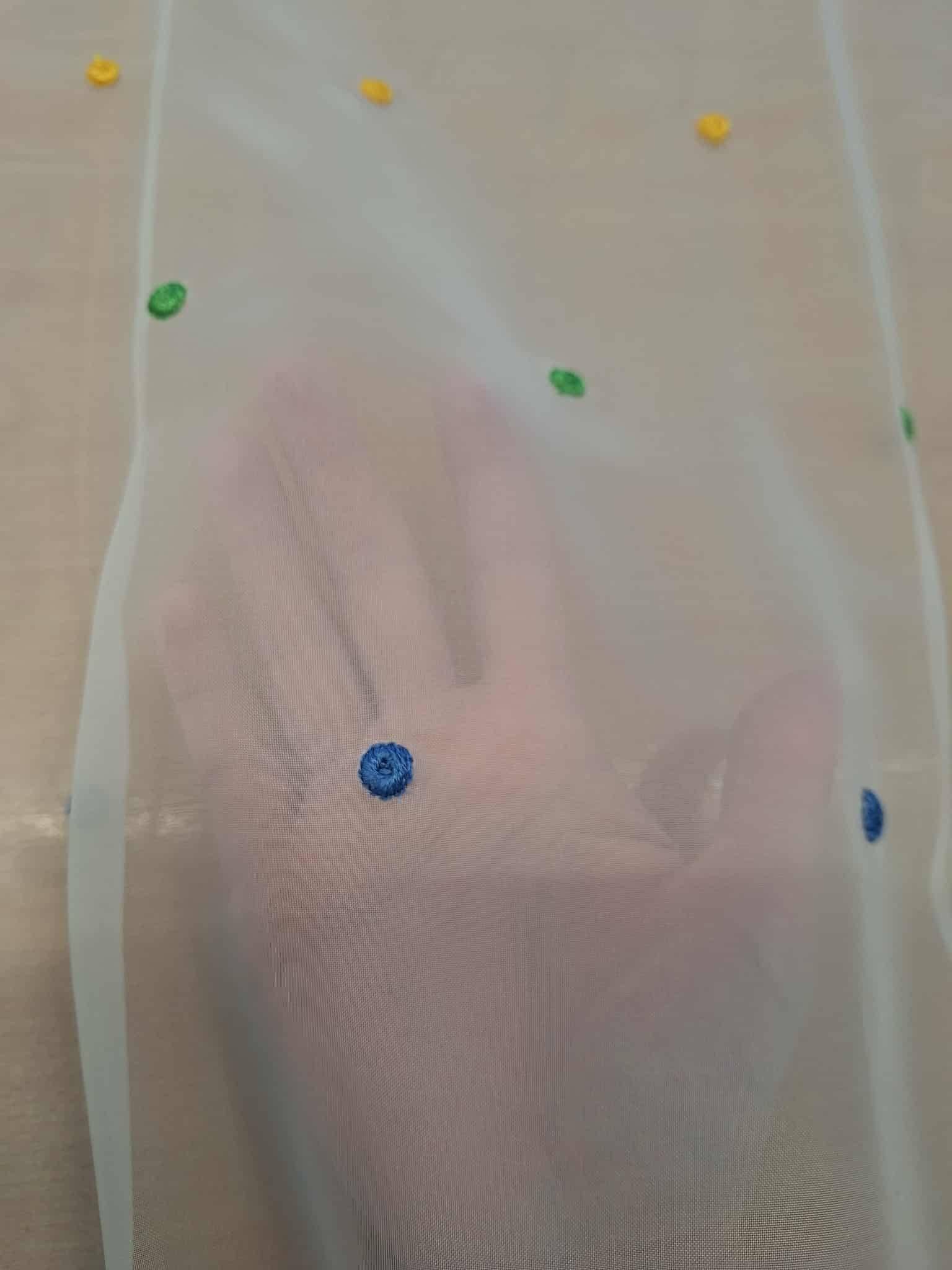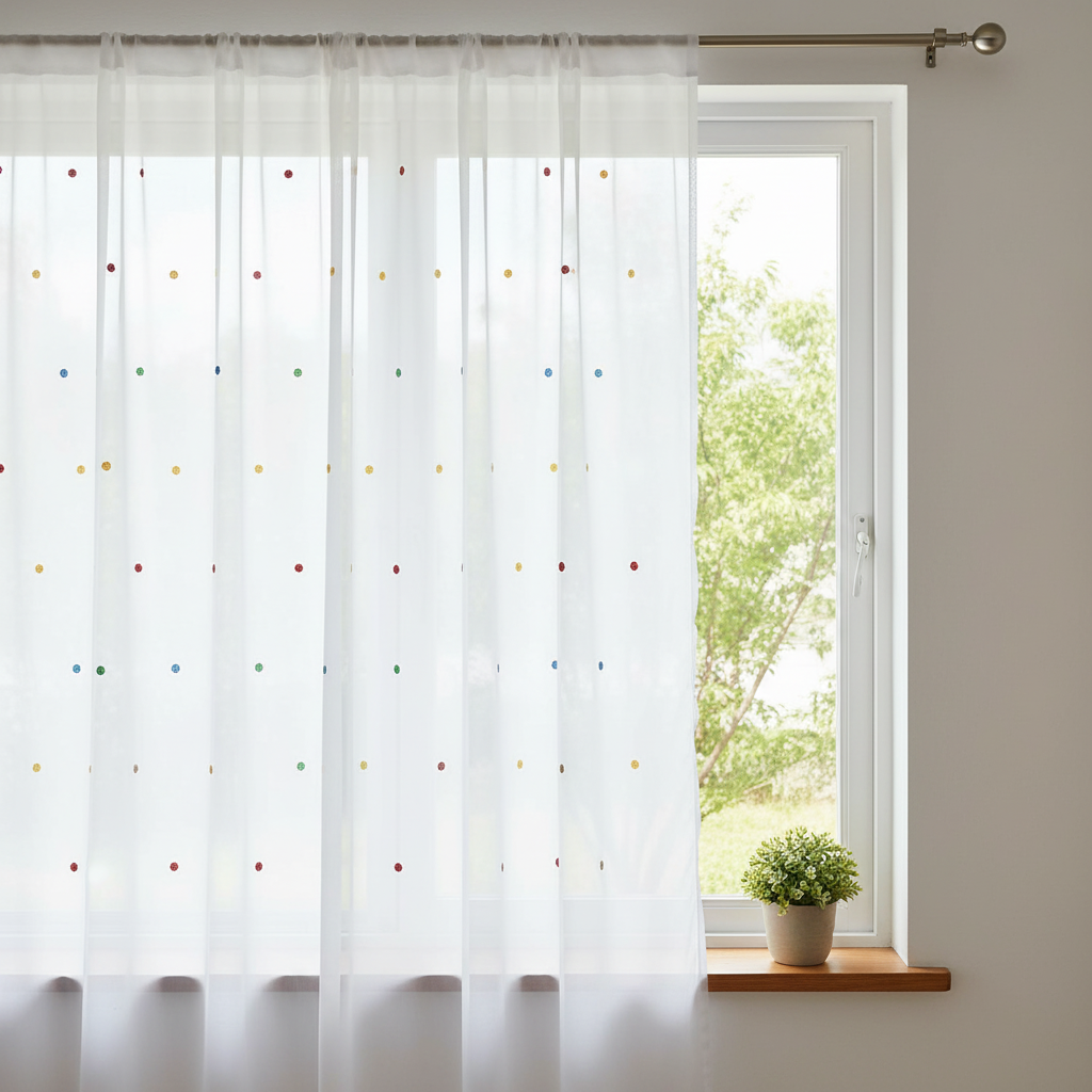 Voile függöny ólomzsinórral. Elszórtan pöttyös 3D hímzéssel. A pöttyök színei: sárga, piros, kék és zöld vegyesen.