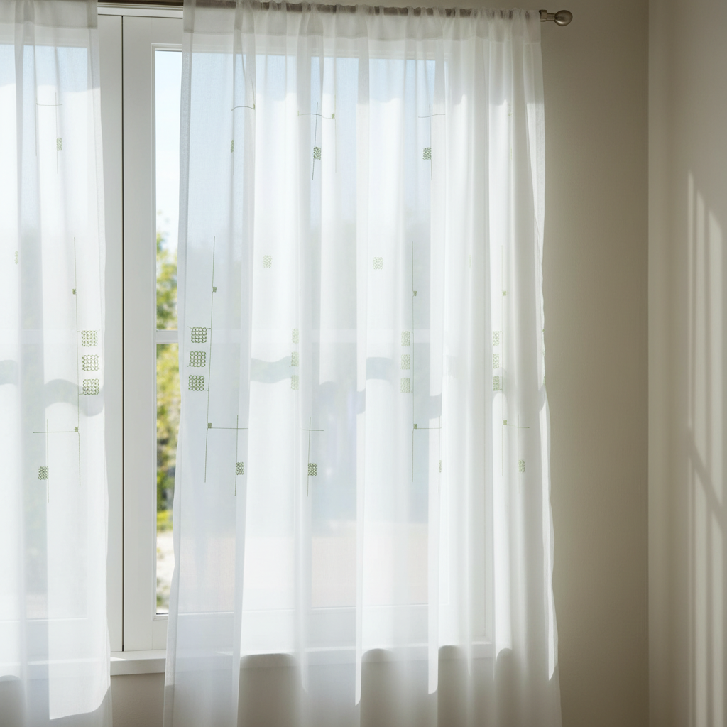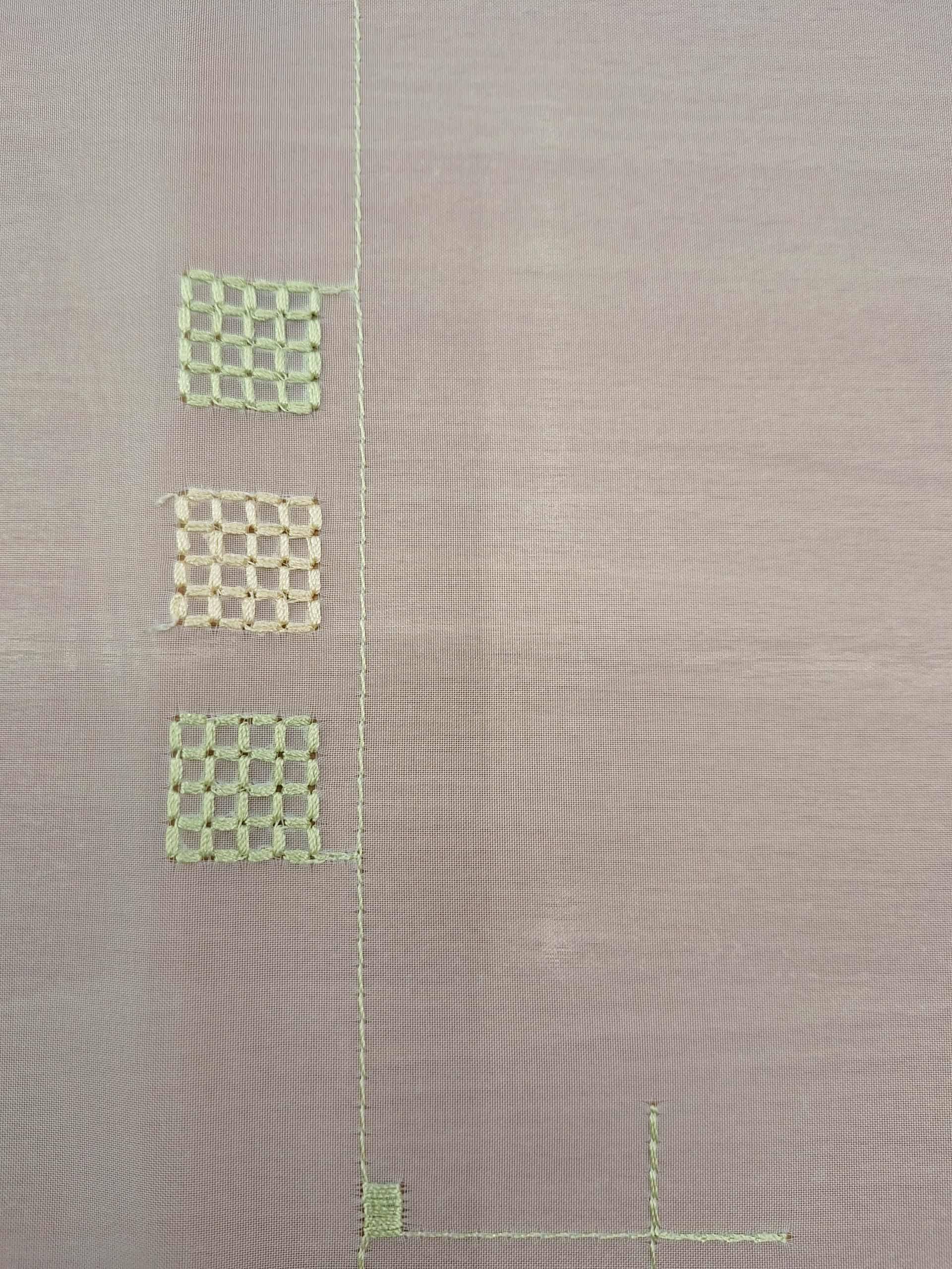 Voile alapon hímzett kocka mintás zöld-ekrü színben