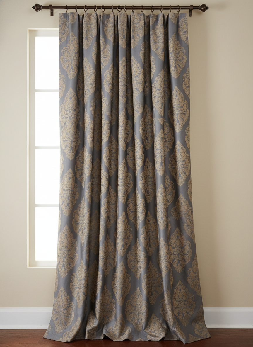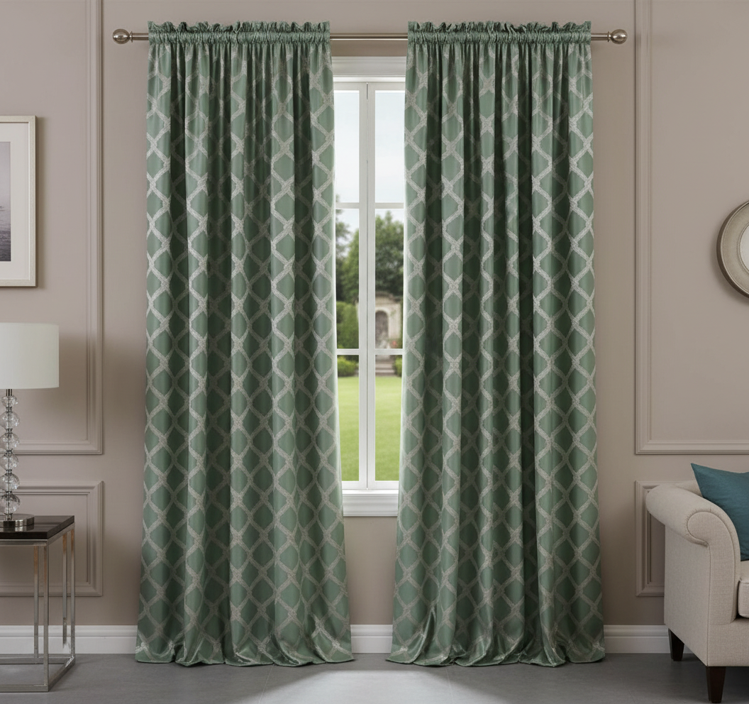Fényes kékes-zöld sötétítő függöny, fémes színhatással, az ekrü beszövés matt.